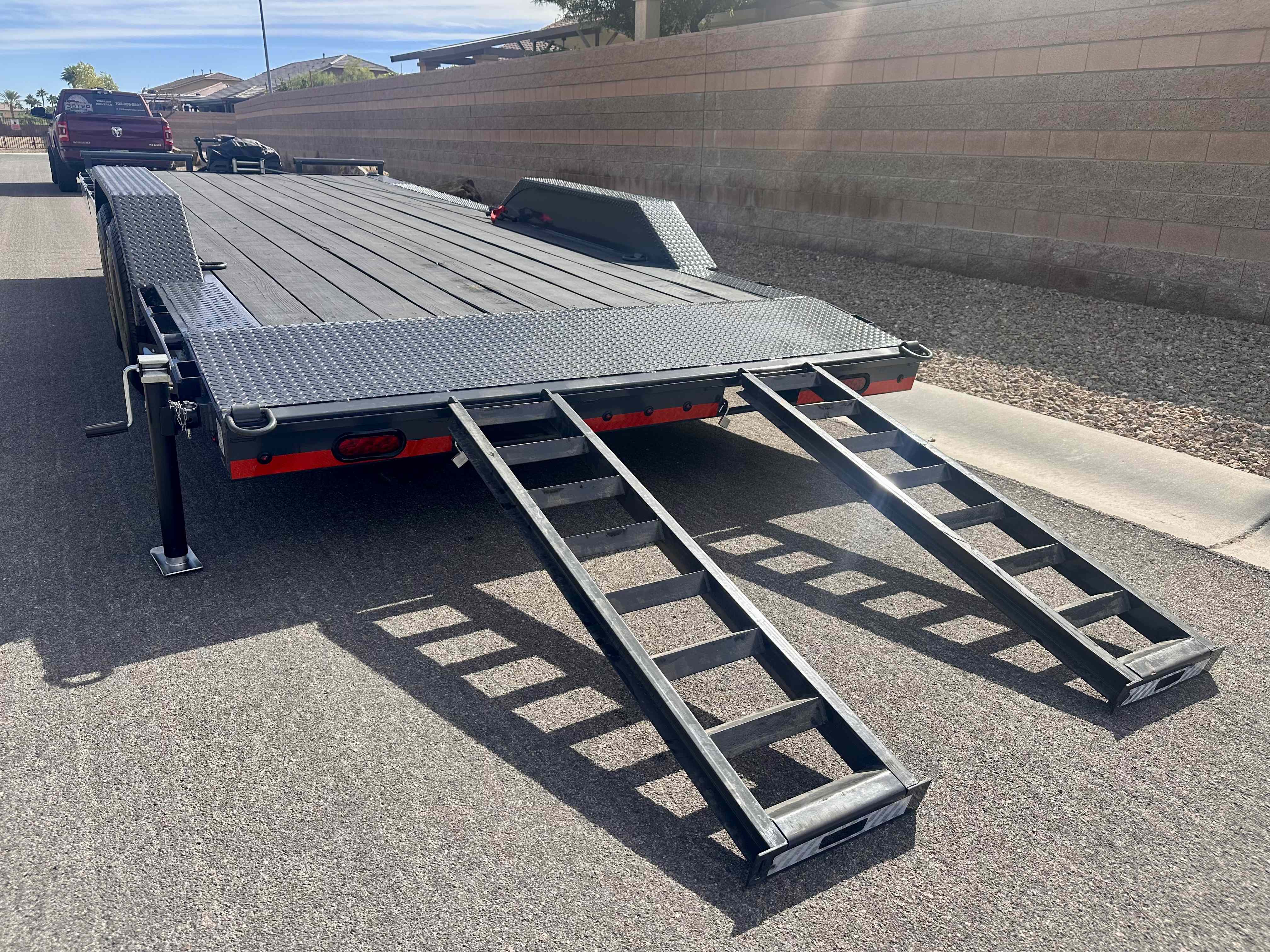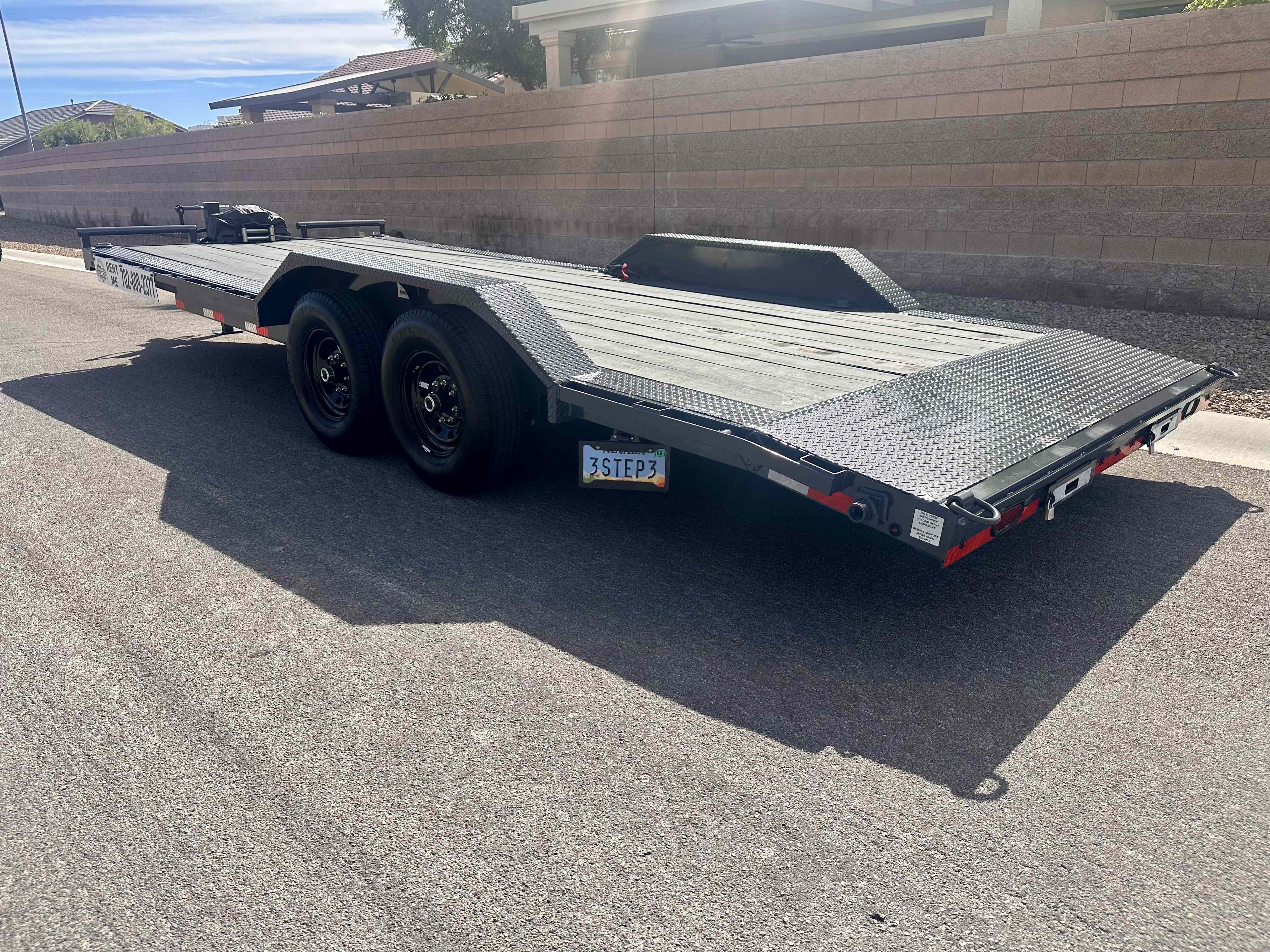 Our heavy-duty equipment trailer is built to handle the big jobs. Whether you're hauling a heavy-duty truck, skid steer, tractor, or large freight, this trailer gets it done. Equipped with an on-board 12,000 lb winch and multiple tie-down points, loading and securing your equipment is fast, safe, and stress-free — no matter the size of the haul. The go-to flatbed trailer rental for contractors and businesses across Las Vegas, Henderson, and North Las Vegas.